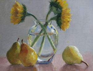 She made her first sale at the age of 36, “My first oil painting to sell was a $300 still life, sold at a show at the Sleepy Dog Coffee house in Eagle River, Alaska. And through the power of Instagram, that collector just contacted me a couple months ago! She now lives in England and still has that painting.” Encouraged by her instructor Craig Nelson, “he was (and still is!) a lunatic about painting – passionate and doing it all the time. He really pushed me to paint fast and stop being fussy with my work,” she continues to paint every day and when she can’t get outside, she sets up beautiful florals in her studio or tricks her pup into being a model.