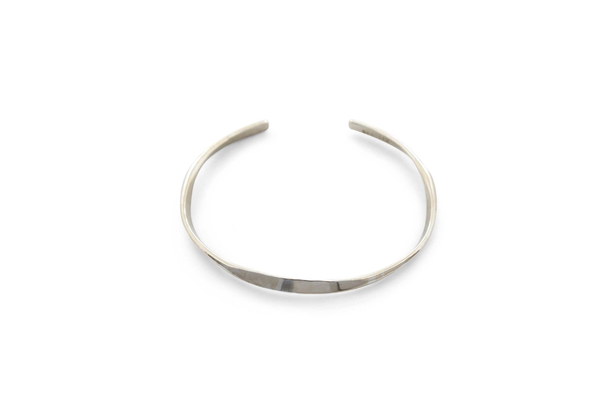 This cuff bracelet began as silver wire that was forged on two sides to create the twisted shape. It was hammered multiple times to create the final asymmetrical form. It was created from a thinner stock of silver wire than Torc Twist Cuff Bracelet I, so it is lighter and narrower in dimension.