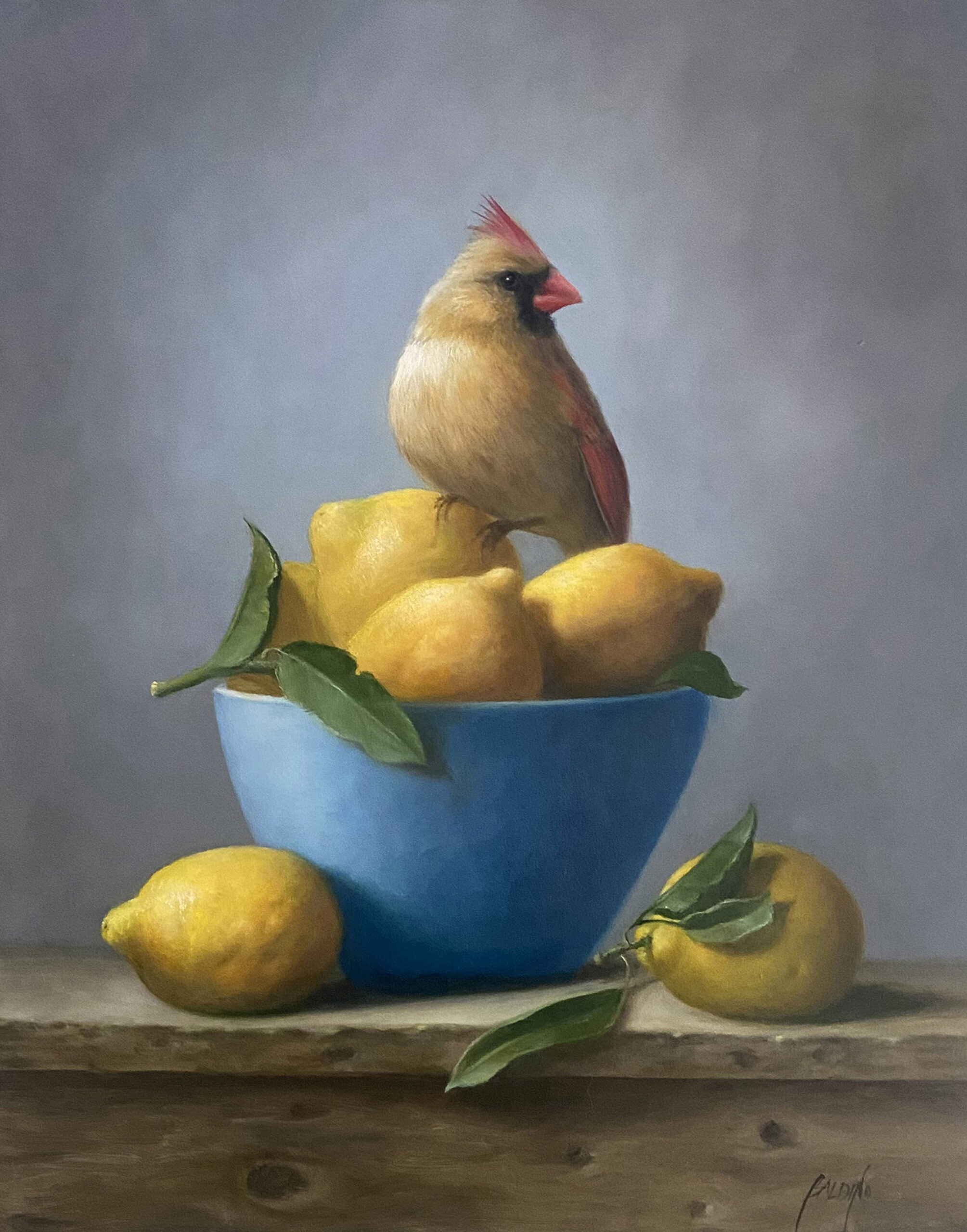 The female Cardinal secures the golden find, a bowl of juicy, ripe lemons.