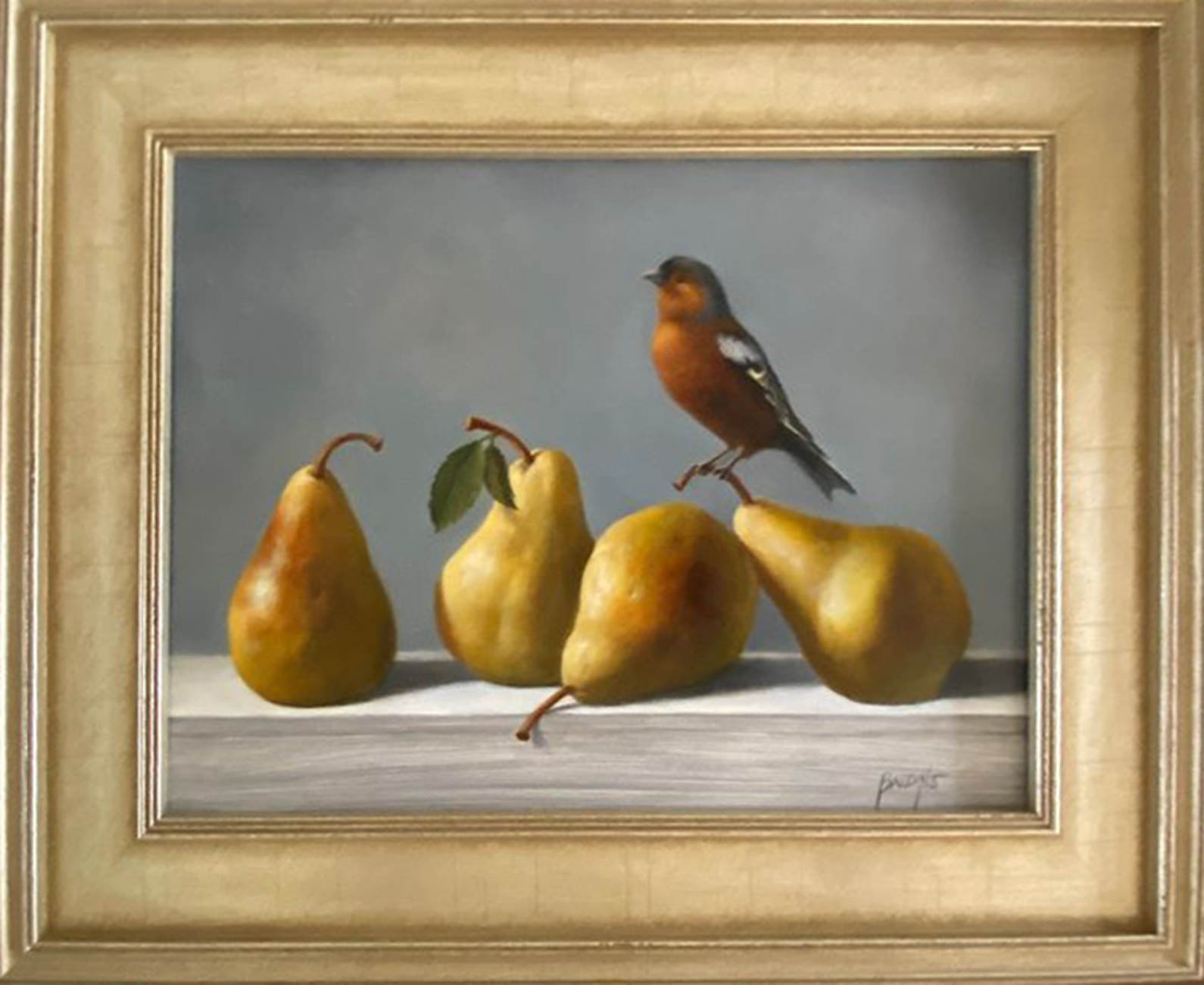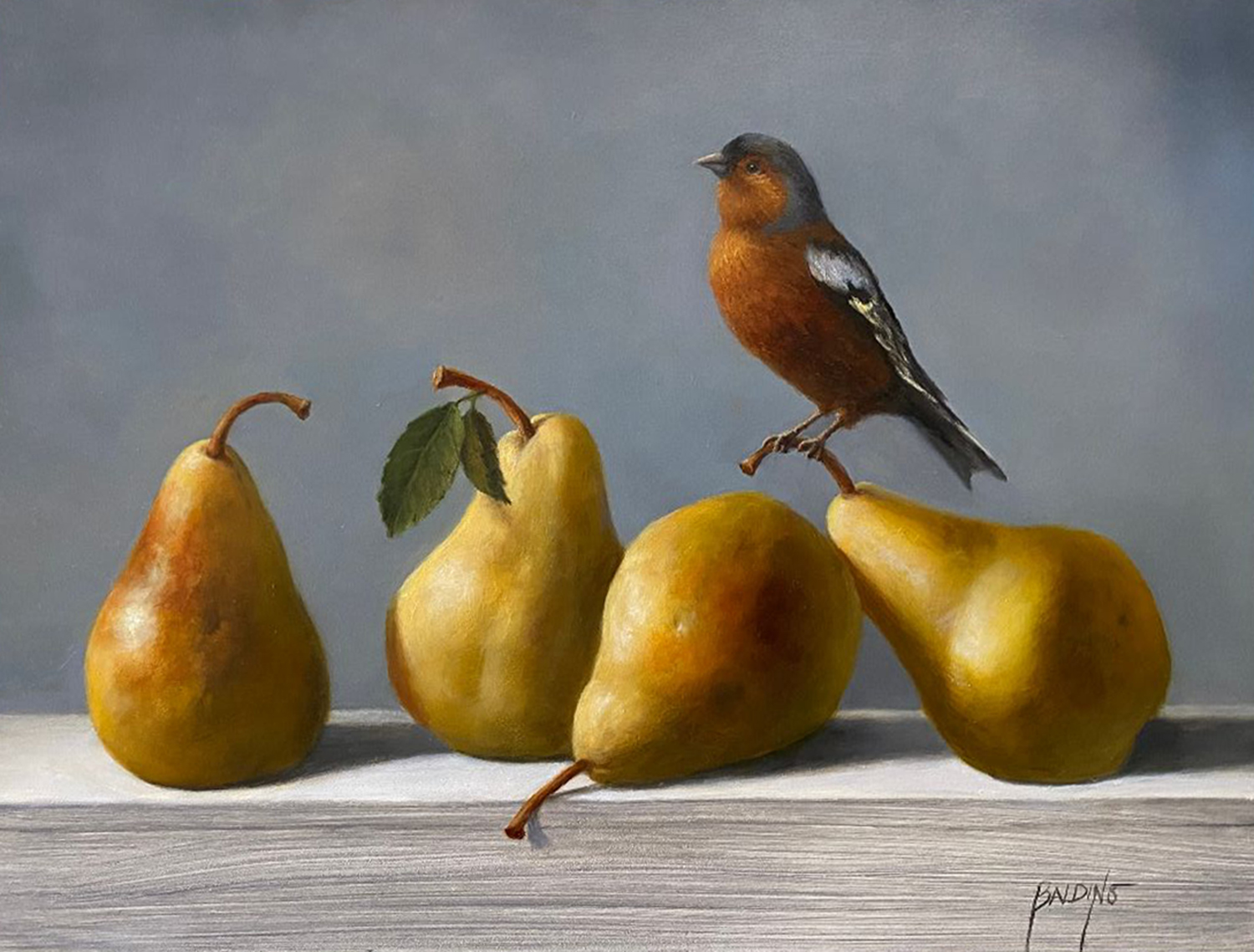 “One of the fortunate things about living in the Northeast is being able to enjoy the four seasons. As the Summer colors slowly fade, Fall is waiting in the wings for the next act. The landscape changes into a beautiful combination of reds, gold and orange. Inspired by this palette, I couldn’t resist painting these juicy, golden pears just coming into season. And this sweet Chaffinch finds the perfect spot to rest before moving on to his next destination. I used the same shade of auburn from the Chaffinch to accent the gold of the pears. By doing so, the pears take on a beautiful glow. Hope you all enjoy the season!” –Patt Baldino