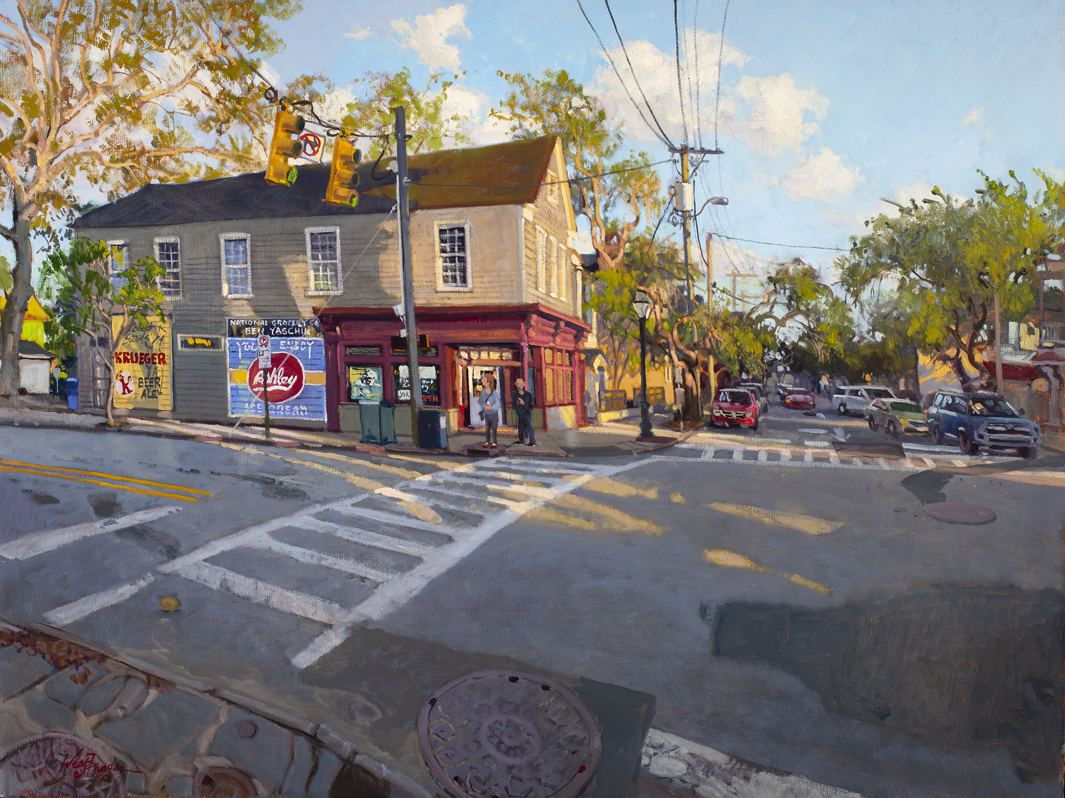 West Fraser often re-visits urban landscapes and creates paintings taking in different views. These paintings serve to record the changes in the neighborhoods as well as highlighting what might stay the same. This lively corner on Spring Street has seen a lot of change in the 15 years since West first painted the scene, but it remains a hub of the neighborhood even as the denizens of the area have changed.