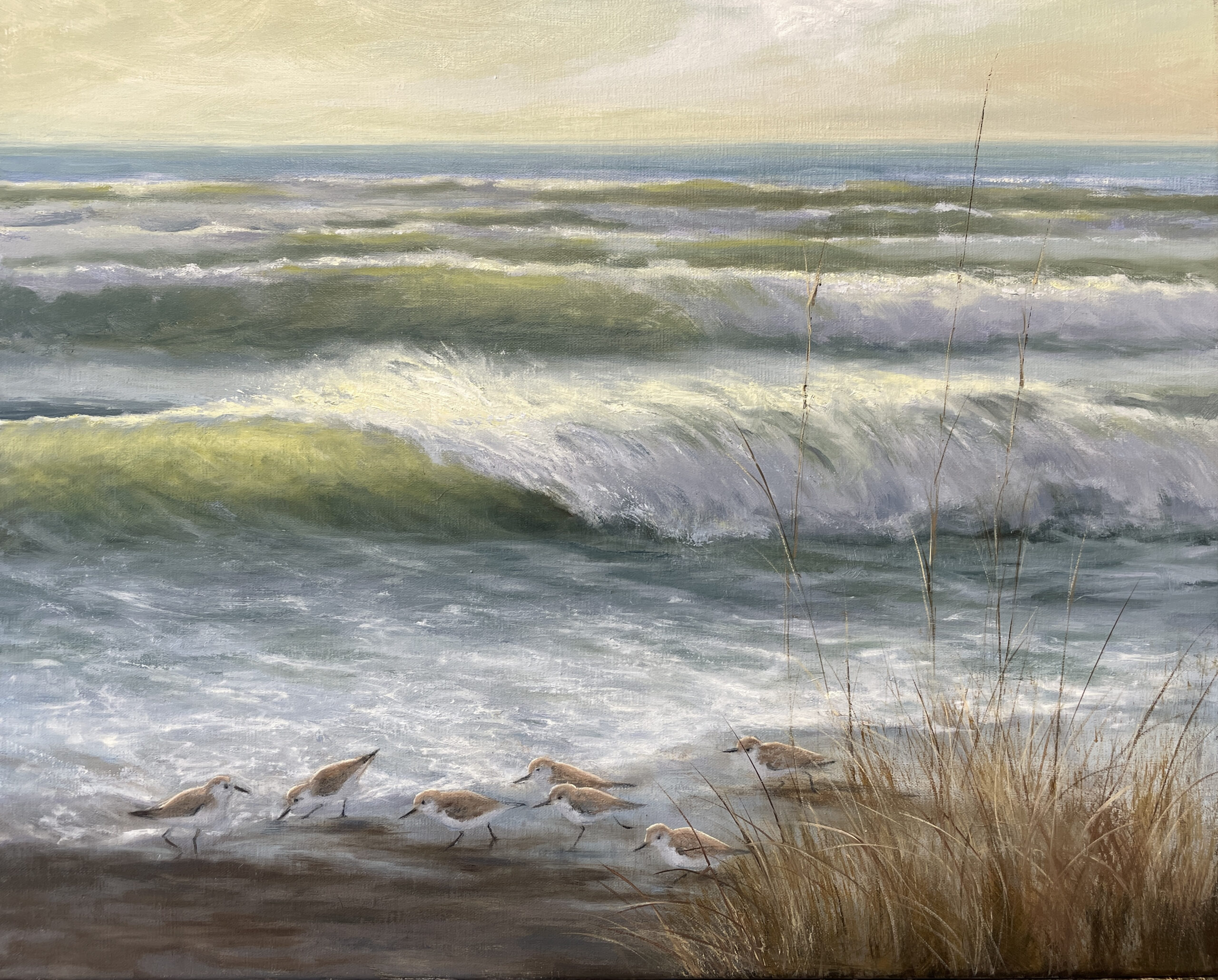 One of my favorite parts of going to the beach, watching the sanderlings scurry along the shoreline. Mary Erickson captures the light in the water and the movement of the birds so well.