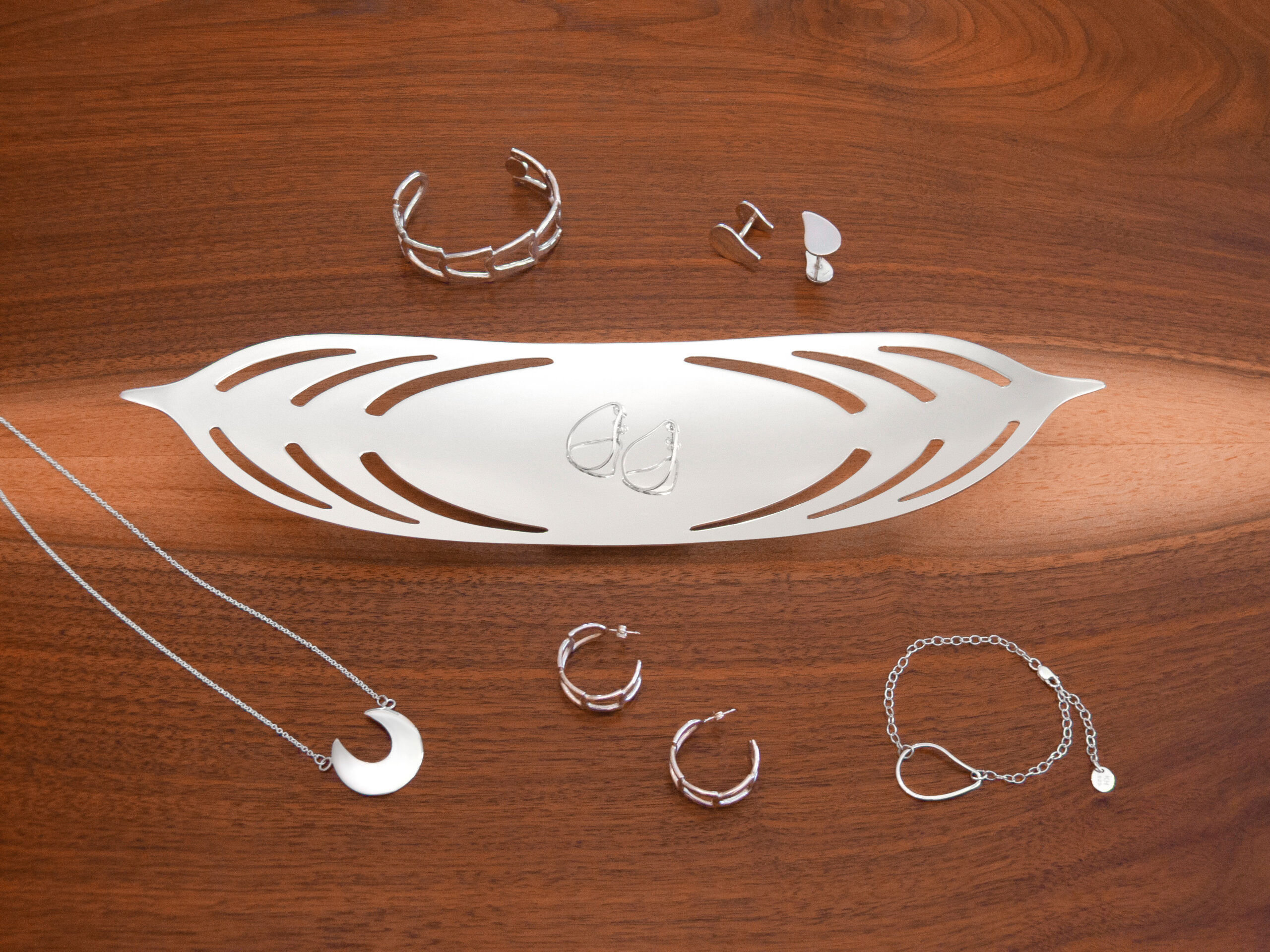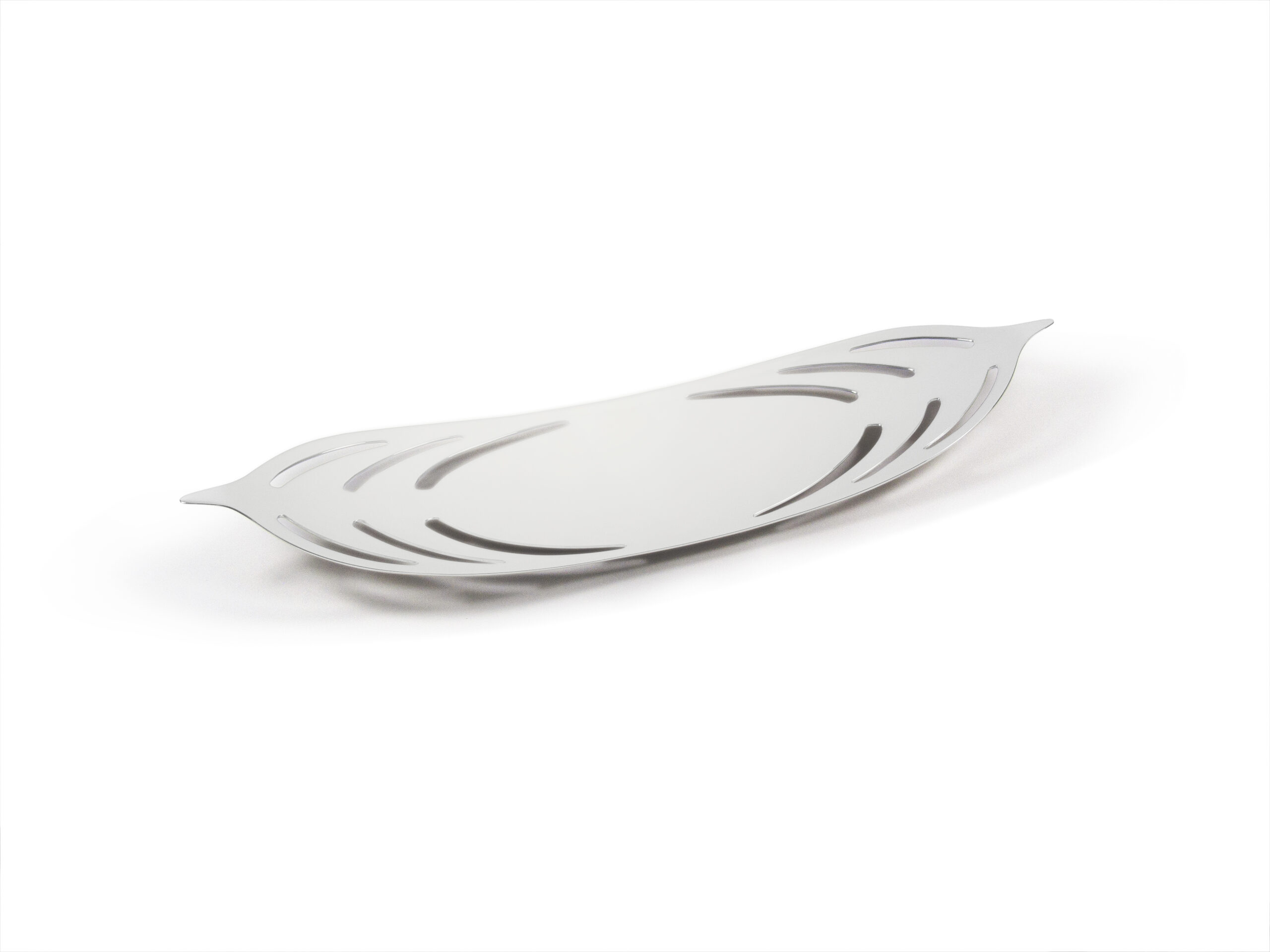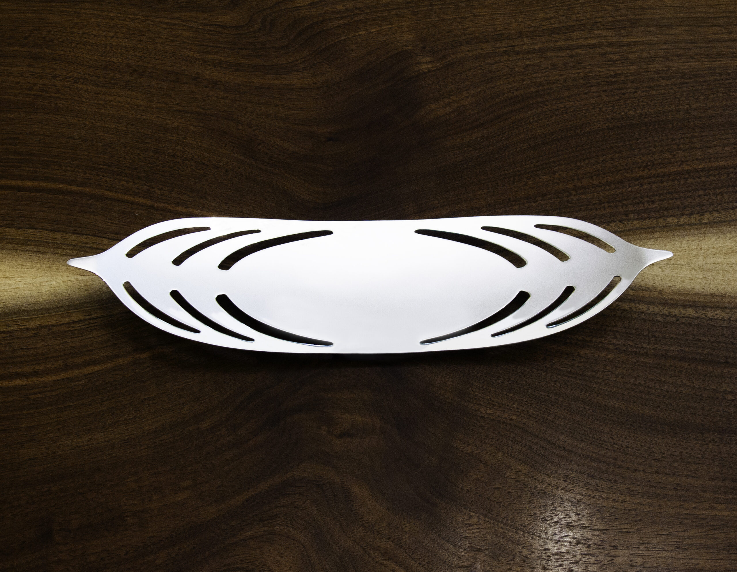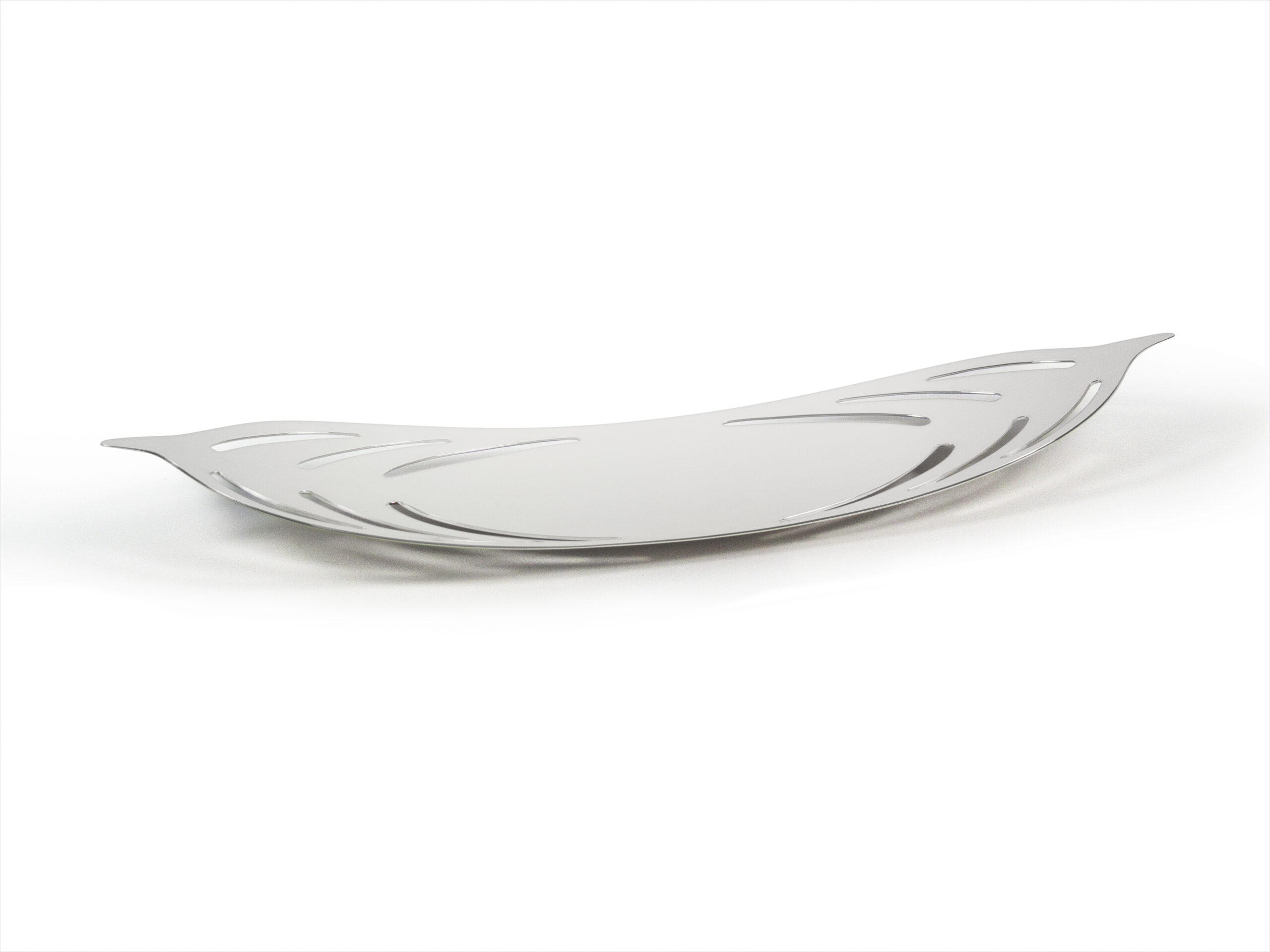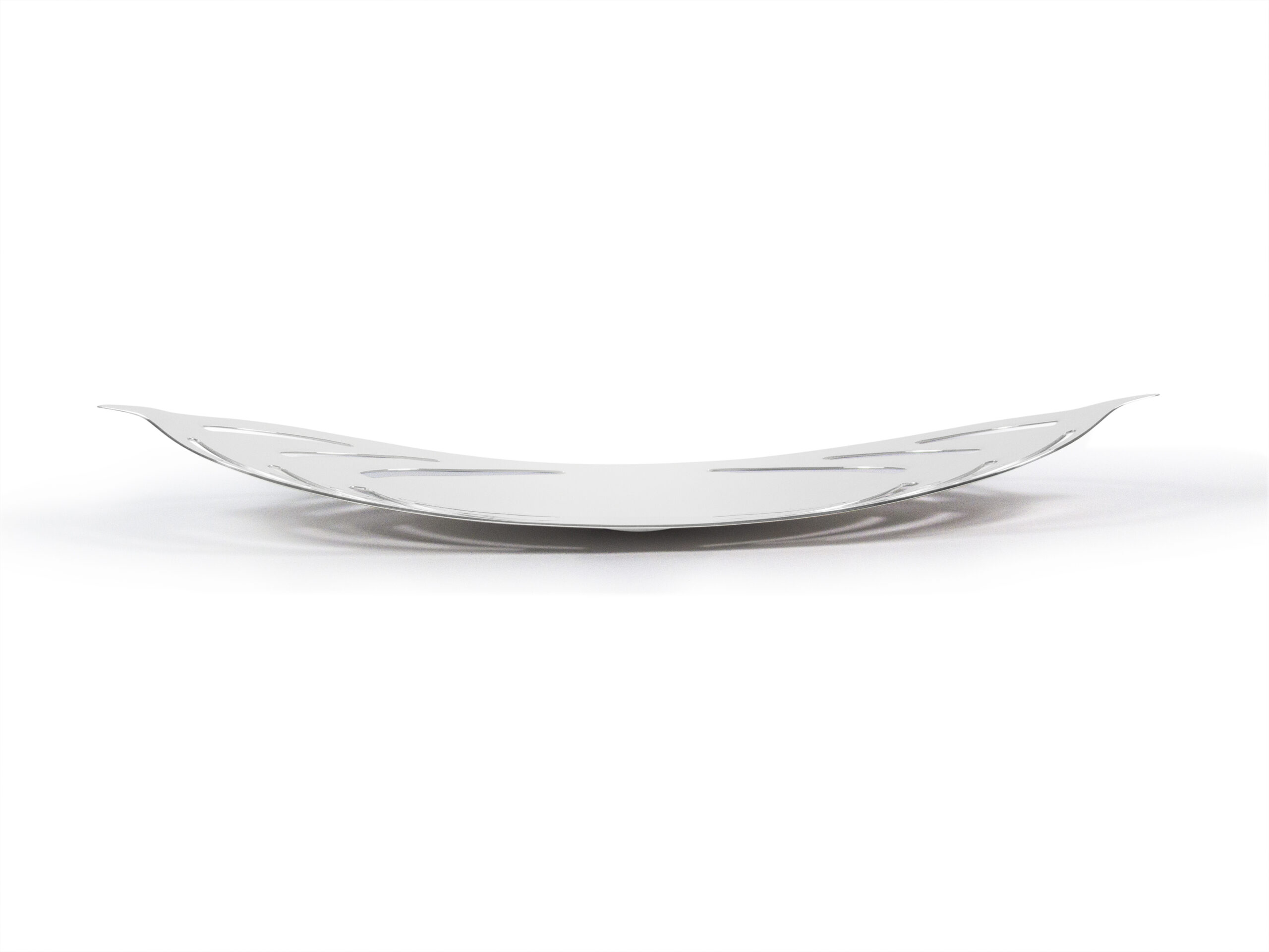 Conceptually I have continued that theme of the strength and fortitude of the palmetto tree in this silver dish and the design visually references palmetto fronds. The radiating shapes were pierced by hand to echo the way light breaks through palmetto leaves. The dish has a gentle curving contour and is supported by a small oval foot underneath, which provides stability and slight elevation. Both the interior and exterior have a high shine, mirror finish.”