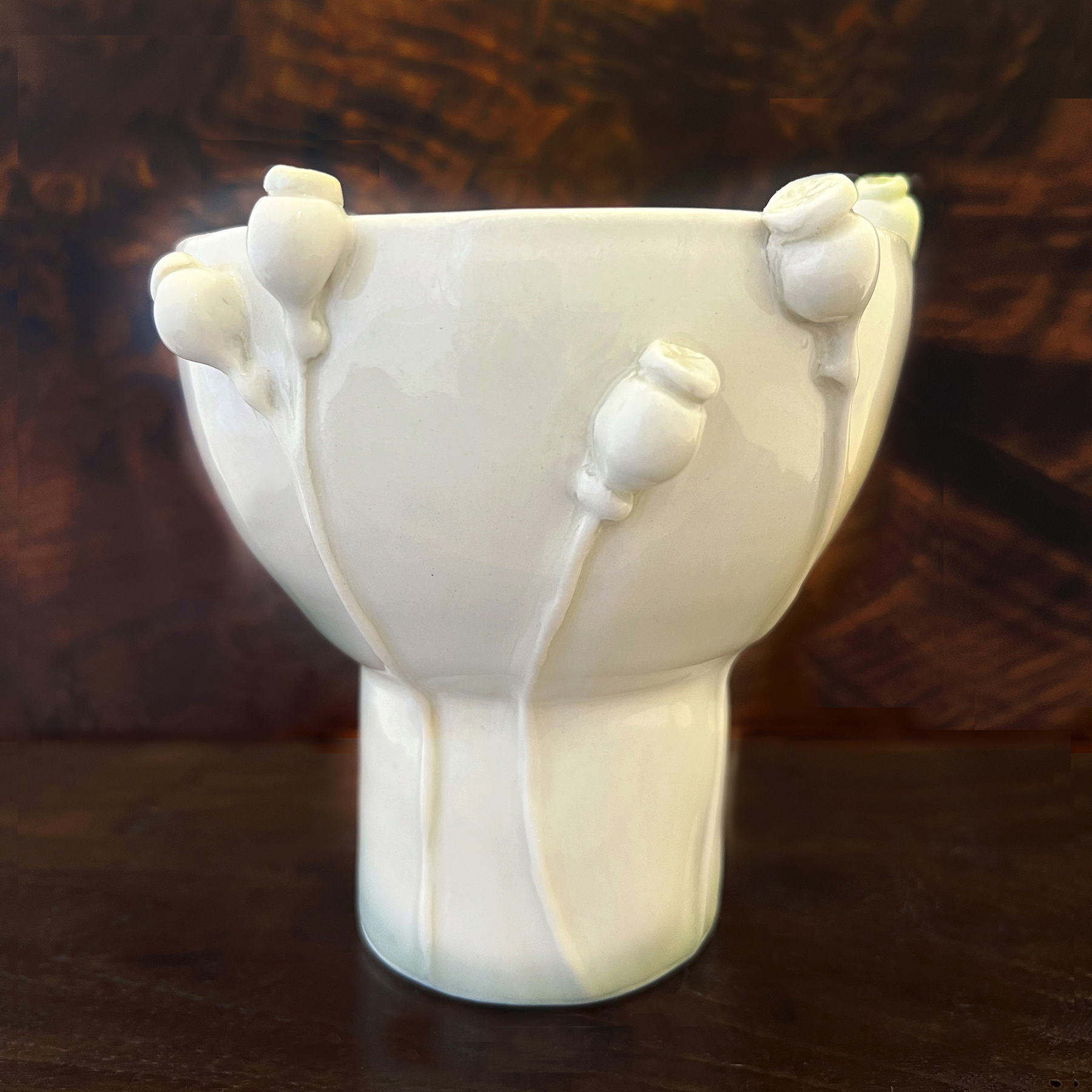 Porcelain Wheel thrown with hand built embellishments. 5 1/2 inches tall, 5 1/2 inch diameter