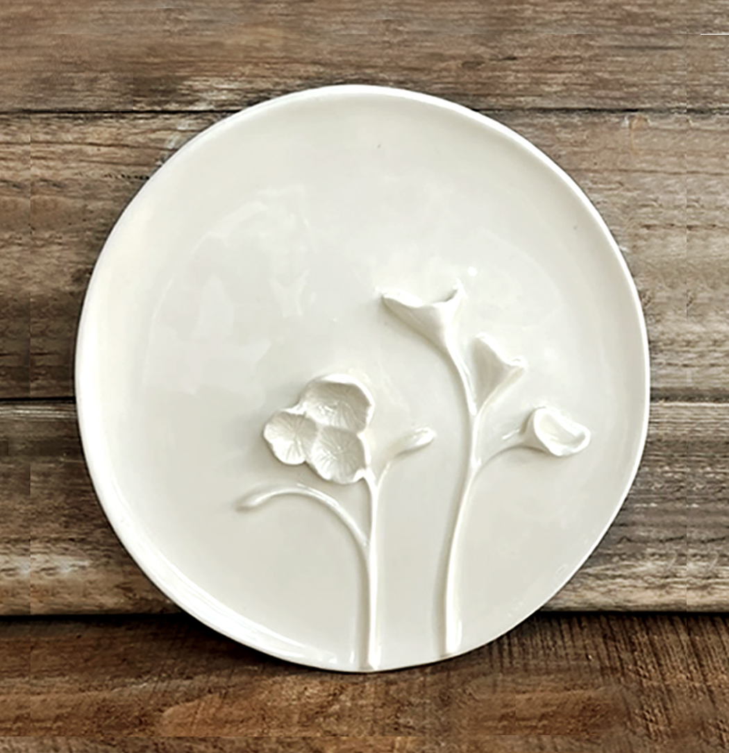 Wheel thrown porcelain plate embelished with a hand-built floral design. Great for making a personal charcuterie and cheese plate!