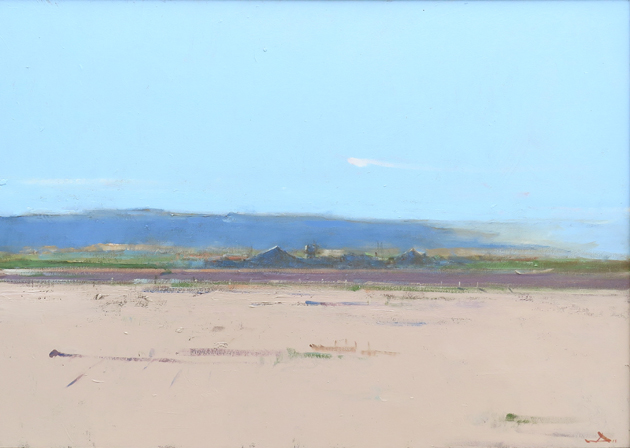 The subtle hint of vegetables growing in rows on farmland in San Lucas, California.