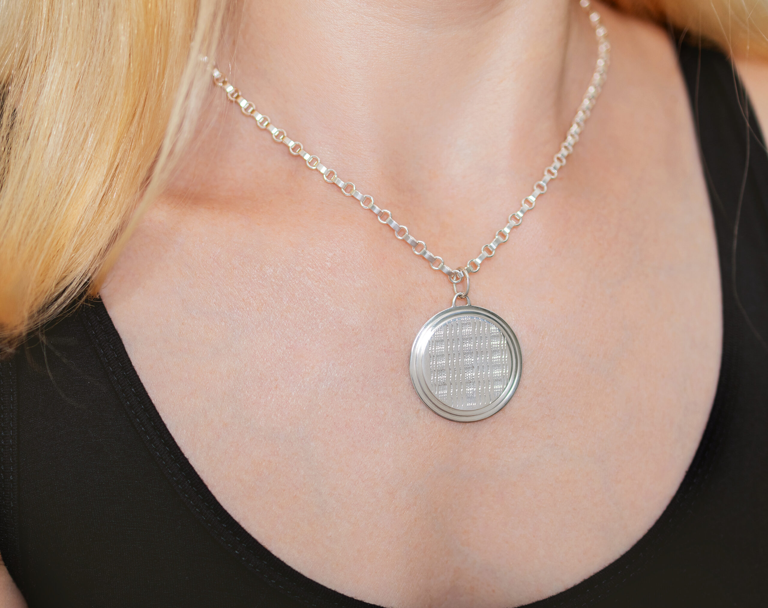 Rialto PendantLarge is a contemporary sterling silver necklace featuring a Guilloche pattern of textured, undulating lines. The unique flat oval and round link silver chain highlights this striking pendant elegantly.